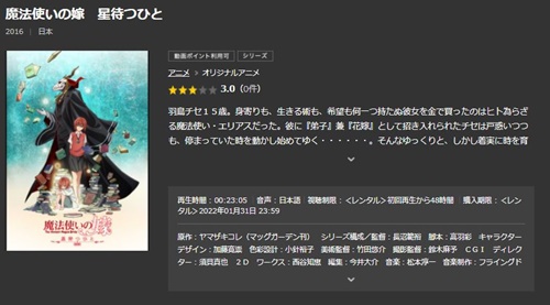 劇場版アニメ「魔法使いの嫁 星待つひと 前中後篇」の無料動画が観れる動画配信サイトを調査した結果「TSUTAYA DISCAS」で無料視聴できることがわかりました